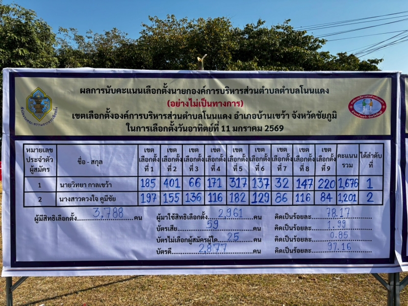 ประกาศและแจ้งผลการรวมคะแนนเลือกตั้ง “การเลือกตั้งนายกองค์การบริหารส่วนตำบลโนนแดง (อย่างไม่เป็นทางการ)