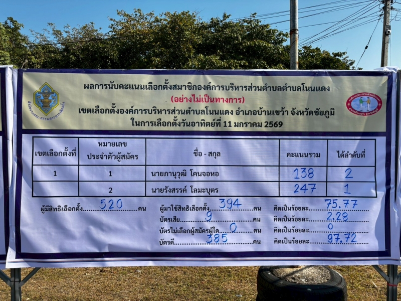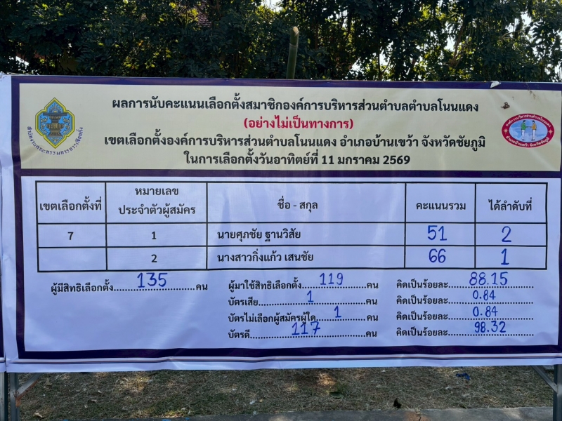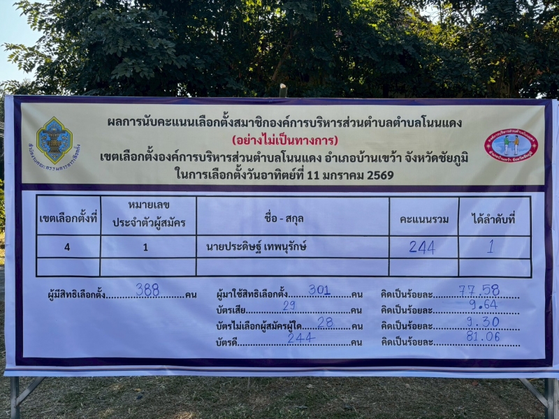 คณะกรรมการการเลือกตั้งประจำองค์การบริหารส่วนตำบลโนนแดง ประกาศและแจ้งผลการรวมคะแนนเลือกตั้ง “การเลือกตั้งนายกองค์การบริหารส่วนตำบลโนนแดง และสมาชิกสภาองค์การบริหารส่วนตำบลโนนแดง ทั้ง 9 เขตเลือกตั้ง (อย่างไม่เป็นทางการ) ในวันอาทิตย์ ที่ 11 มกราคม 2569 ดังนี้