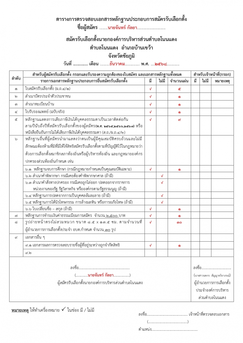 หลักฐานการสมัครของผู้สมัครรับเลือกตั้ง อบต....