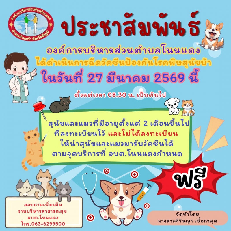 ประชาสัมพันธ์การฉีดวัคซีนป้องกันโรคพิษสุนัขบ้า ประจำปี 2569 ในพื้นที่ตำบลโนนแดง...