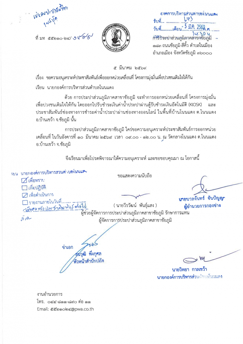การประปาส่วนภูมิภาคสาขาชัยภูมิ จำทำการออกหน่วยเคลื่อนที่ โครงการมุ่งมั่นเพื่อปวงชนเติมใจให้กัน ...