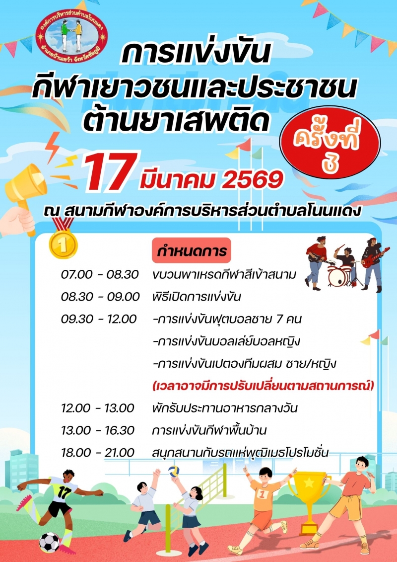 การแข่งขันกีฬาเยาวชนและประชาชนต้านยาเสพติดตำบลโนนแดง ครั้งที่ 3 ในวันที่ 17 มีนาคม 2569