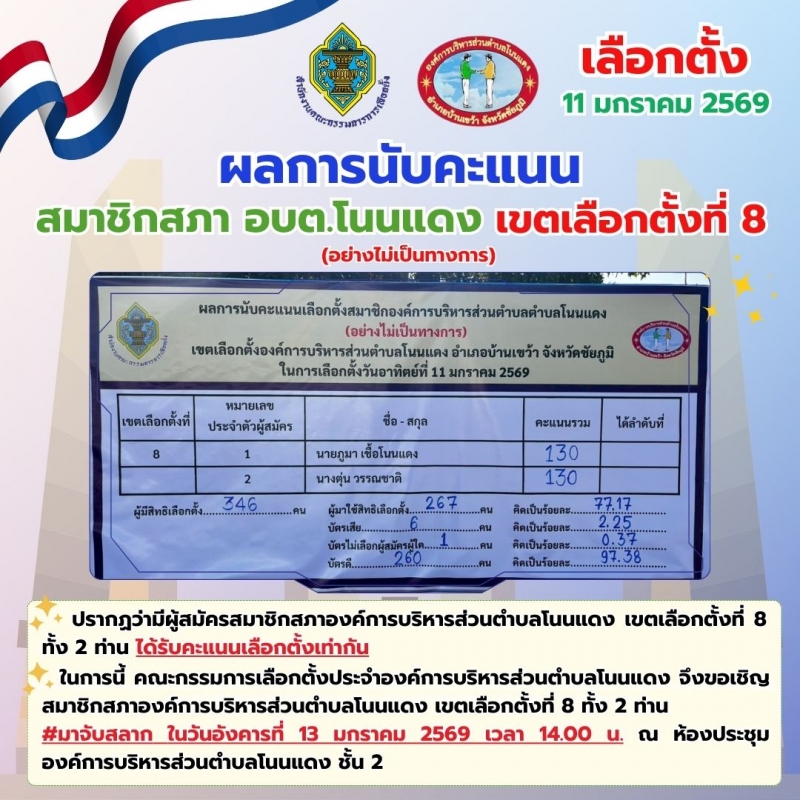 ผลการจับฉลากเลือกตั้ง ผู้สมัครสมาชิกสภาองค์การบริหารส่วนตำบลโนนแดง เขตเลือกตั้งที่ 8 ต.โนนแดง อ.บ้านเขว้า จ.ชัยภูมิ ...