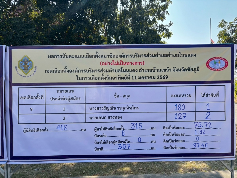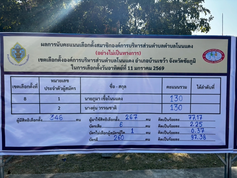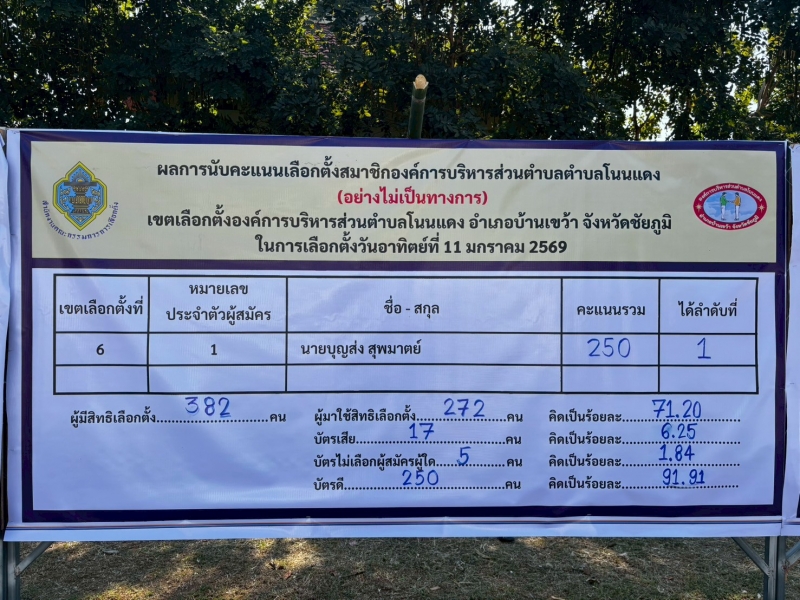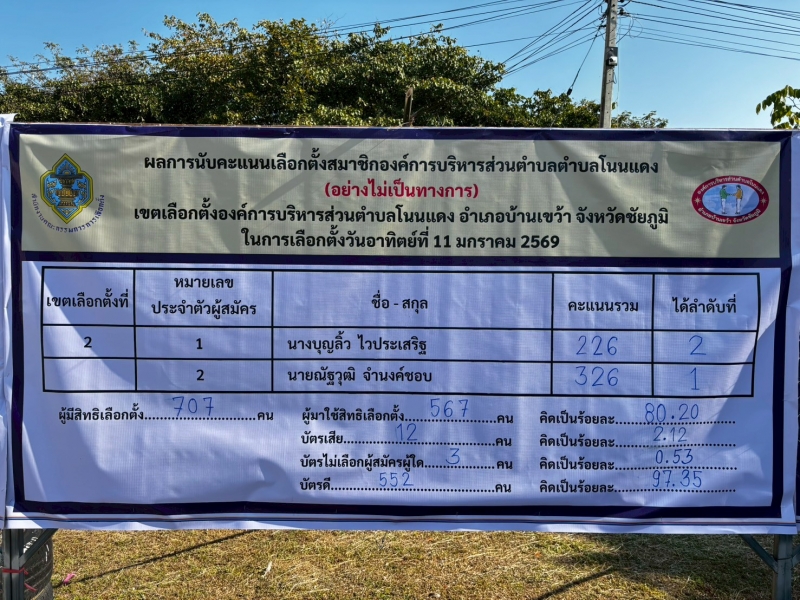คณะกรรมการการเลือกตั้งประจำองค์การบริหารส่วนตำบลโนนแดง ประกาศและแจ้งผลการรวมคะแนนเลือกตั้ง “การเลือกตั้งนายกองค์การบริหารส่วนตำบลโนนแดง และสมาชิกสภาองค์การบริหารส่วนตำบลโนนแดง ทั้ง 9 เขตเลือกตั้ง (อย่างไม่เป็นทางการ) ในวันอาทิตย์ ที่ 11 มกราคม 2569 ดังนี้