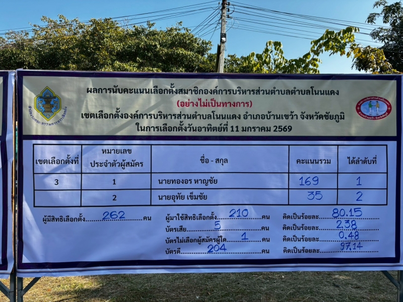 “ เบอร์ 1 ” นายทองอร หาญชัย ผลคะแนนรวมอย่างไม่เป็นทางการ ได้ 169 คะแนน