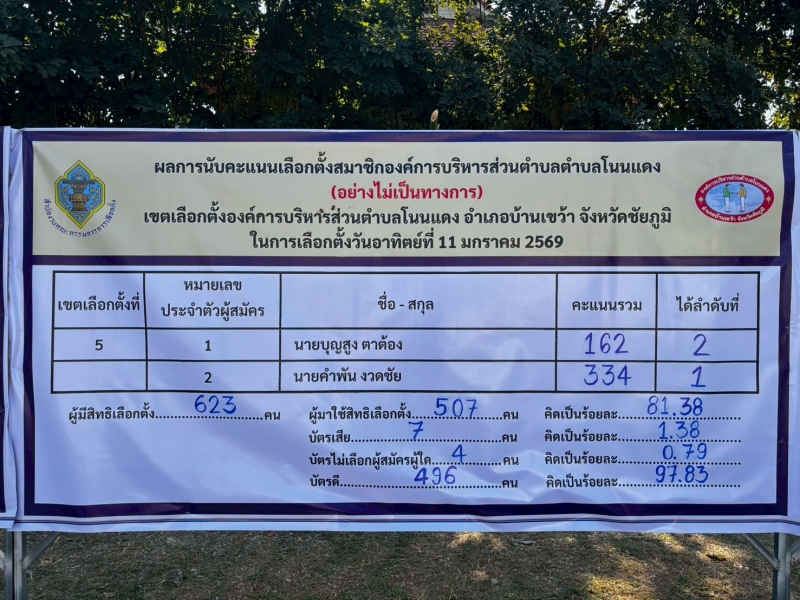 “ เบอร์ 1 ” นายบุญสูง ตาต้อง ผลคะแนนรวมอย่างไม่เป็นทางการ ได้ 162 คะแนน